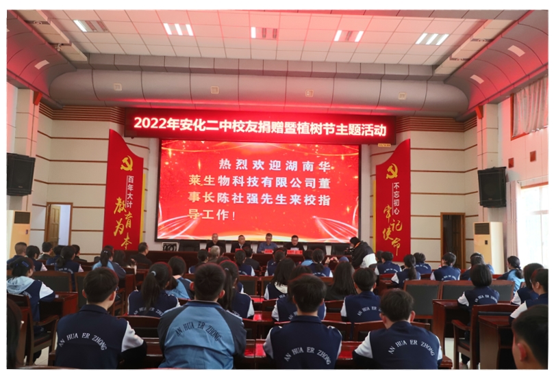 本网讯(通讯员 陈中飞) 3月12日,正值我国第44个植树节。湖南华莱生物科技有限公司董事长、安化二中名誉校友陈社强,向学校捐赠地径1米多的百年杨梅树两棵。上午10点,安化二中在学校办公楼一楼会议室隆重举行捐赠仪式。