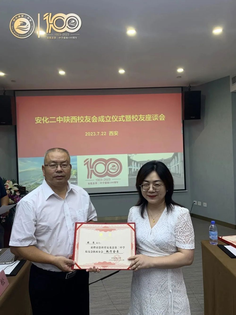 谌勇代表学校和安化二中校友总会宣布了安化二中校友会陕西分会机构成员名单:名誉会长、总顾问黄志刚,顾问肖忠东、方予民;会长吕向荣,执行会长王荣淇、胡贵山、刘志明、张琴;秘书长胡松,执行秘书长王放、廖双峰、马轩。